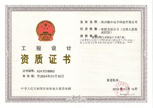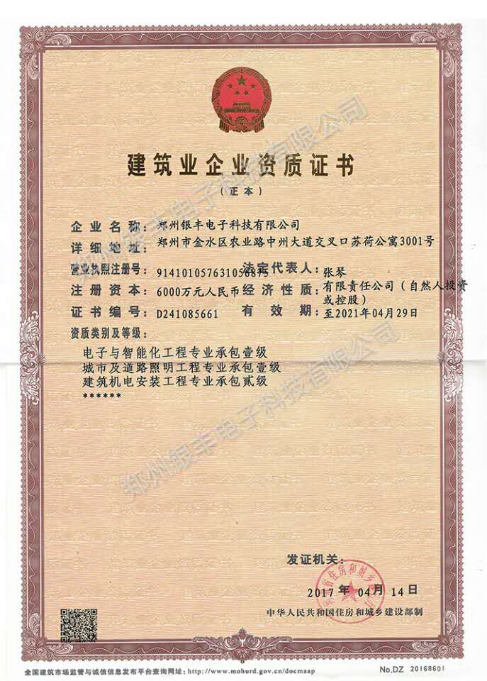 公司是涉密信息系統(tǒng)集成乙級(jí)資質(zhì)企業(yè)、建筑智能化系統(tǒng)設(shè)計(jì)專(zhuān)項(xiàng)乙級(jí)資質(zhì)企業(yè)、電子與智能化工程專(zhuān)業(yè)承包一級(jí)資質(zhì)企業(yè)、機(jī)電設(shè)備安裝工程專(zhuān)業(yè)承包一級(jí)資質(zhì)企業(yè)、城市與道路照明工程專(zhuān)業(yè)承包一級(jí)資質(zhì)企業(yè)、專(zhuān)業(yè)燈光工程綜合技術(shù)能力一級(jí)資質(zhì)企業(yè)、專(zhuān)業(yè)音響工程綜合技術(shù)能力一級(jí)資質(zhì)企業(yè)、舞臺(tái)機(jī)械工程綜合技術(shù)能力資質(zhì)企業(yè)、音視頻系統(tǒng)集成工程綜合技術(shù)能力一級(jí)資質(zhì)企業(yè)、安全技術(shù)防范服務(wù)一級(jí)資質(zhì)企業(yè);并取得了安全生產(chǎn)許可證,通過(guò)了ISO9001:2008質(zhì)量管理、環(huán)境管理、職業(yè)健康安全管理、信息技術(shù)服務(wù)管理、信息安全管理五大體系認(rèn)證,榮獲了“AAA”級(jí)誠(chéng)信企業(yè)信用等級(jí)證書(shū)。公司是高新技術(shù)企業(yè)、河南科技型中小企業(yè)、河南省軟件企業(yè)、專(zhuān)精特新企業(yè)。